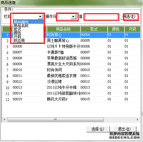 ※“F1选择商品”,在单选里可选“商品编号”或“属性”进行查找商品选择。