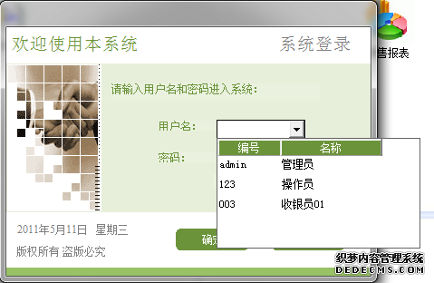 启动软件后,出现上面的登录界面,分别有“管理员”、“操作员”、“业务员01”三个用户(可在用户权限更改),选择用户,初始密码为:123,点击“确定”,登录系统。