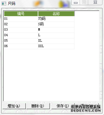尺码:点“尺码”弹出编辑窗口,可“增加” ,“删除”尺码,最后点“保存”,“退出”,这里编辑好尺码主要提供后面的选择。