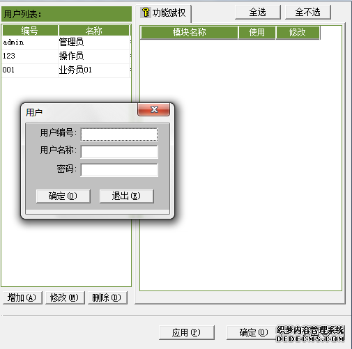 功能赋权:对用户的使用权的限制,单击用户,勾选出赋予的功能。