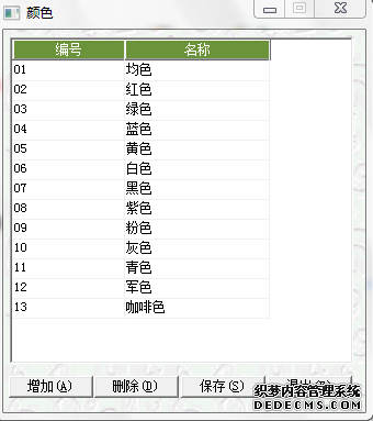 “增加”,在增加的一行,输入相应编号、名称,“删除”点需删除的颜色,点“删除”。